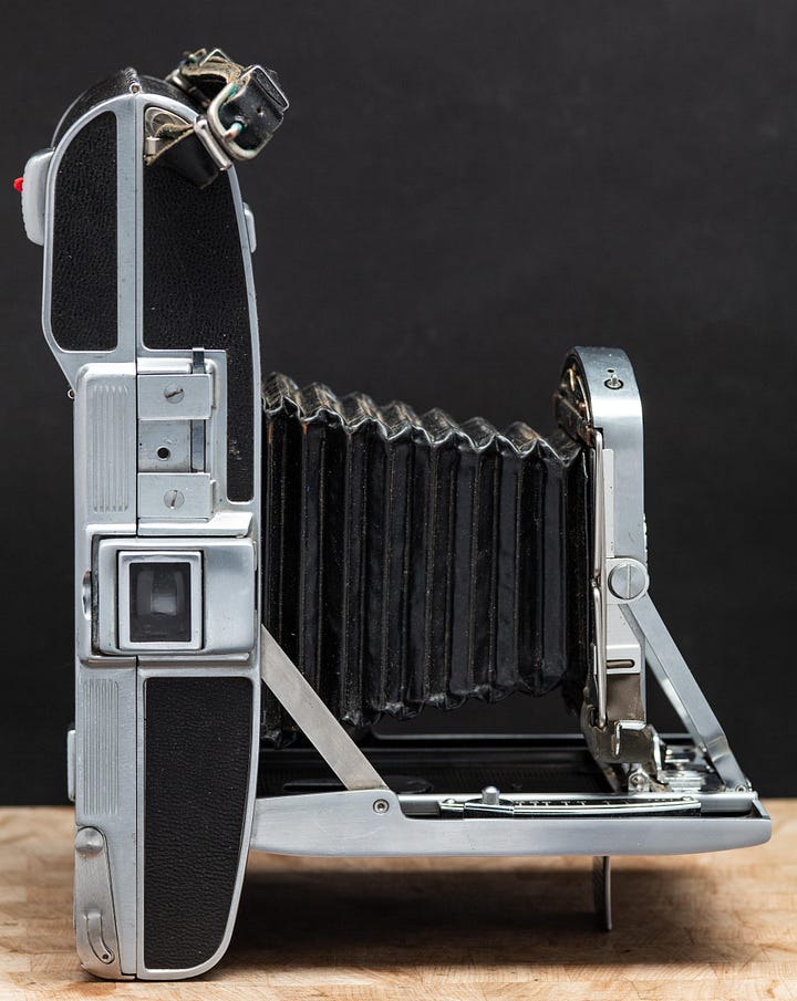 If you look at the picture above, you will see two vertical chambers on either side of the bellows. This would make one think of a typical roll film camera design, but it is not. The roll fit that one would use in this camera had two spools (with 8 exposures per roll of film), and those spools went into the chambers, depending on the purpose of that spool in the Polaroid process.