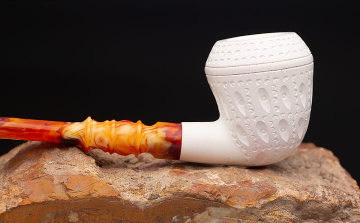 I am not sure who made this Meerschaum, which is not unusual, most Meerschaum makers do not sign their pipes. This is nice and white (it’s made whiter than normal before it’s carved), and it will begin to take on a honeyed color as I touch it, and as I smoke it. You can see what the looks like in my other post, Suck On This!