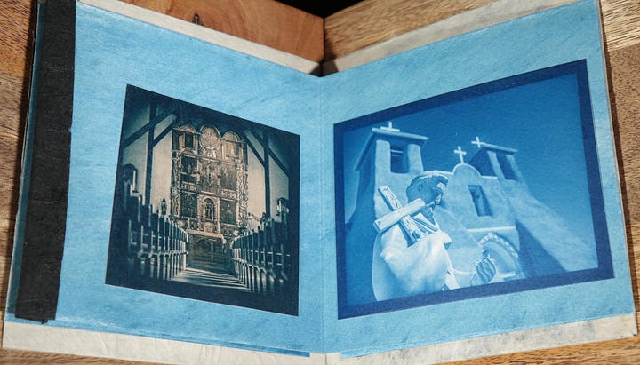 Last week, Mark White, of Eye on I: Projections of a street photographer, posted a story about a zine that he’d just finished, made from Cyanotypes of of the Taos Mission Church, in Taos, New Mexico.