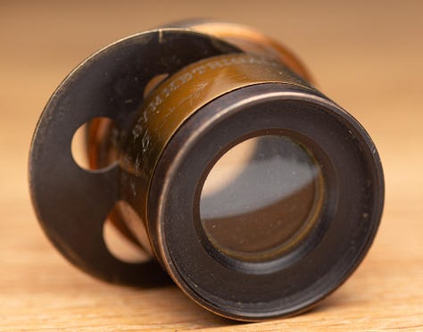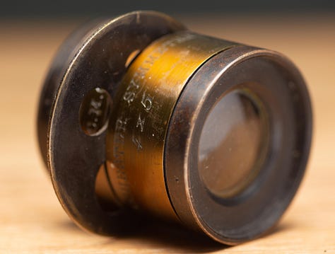 This lens is over 100 years old. It was made by the Rochester Camera Manufacturing Company, of Rochester, New York. In America, Rochester, was the center of the photographic universe in the 19th and early 20th Centuries. The R.C.M., made large format “View” cameras (the kind you’d think of where the photographer would duck under a black cloak to focus his camera), and this was a lens for the company’s 4X5 camera.