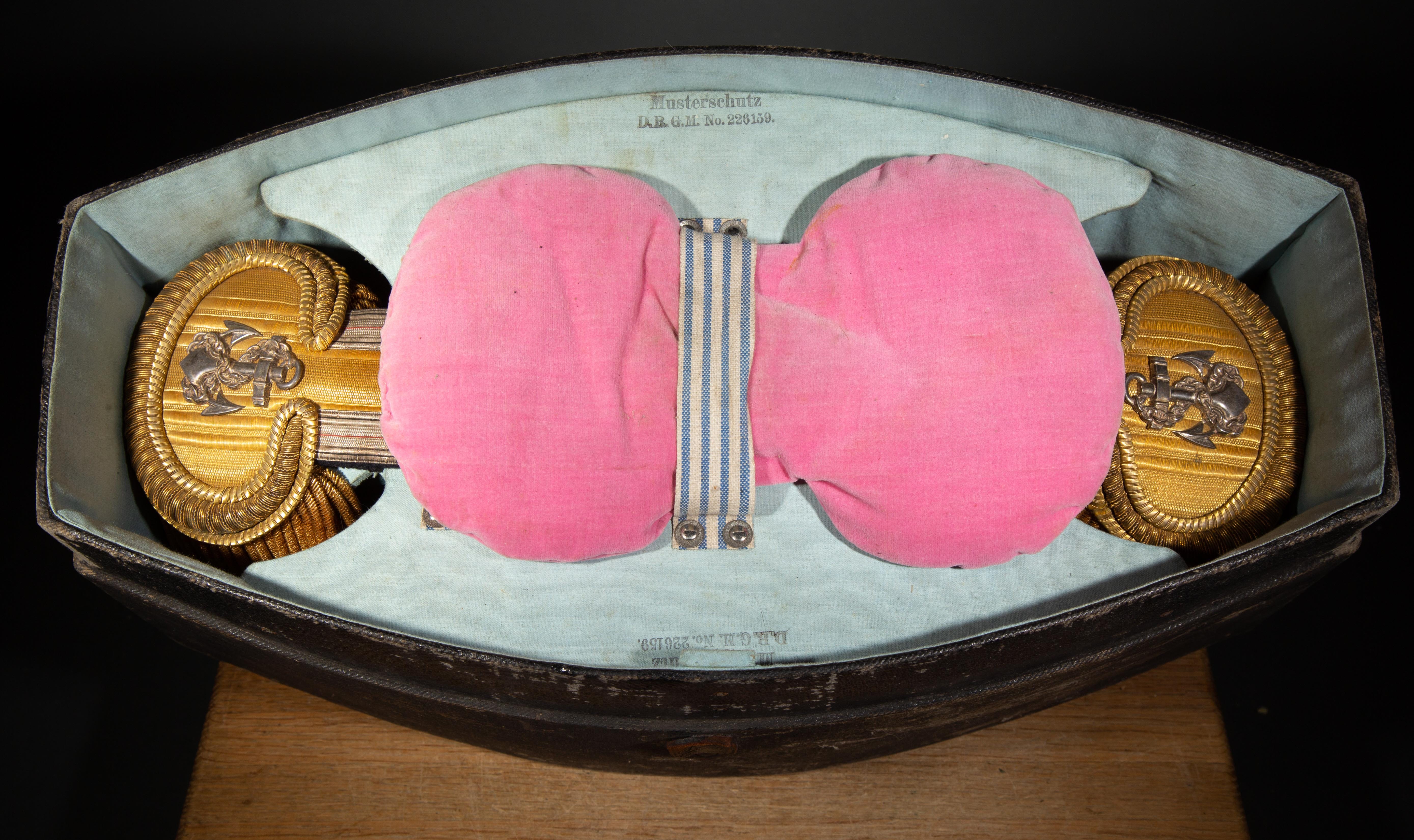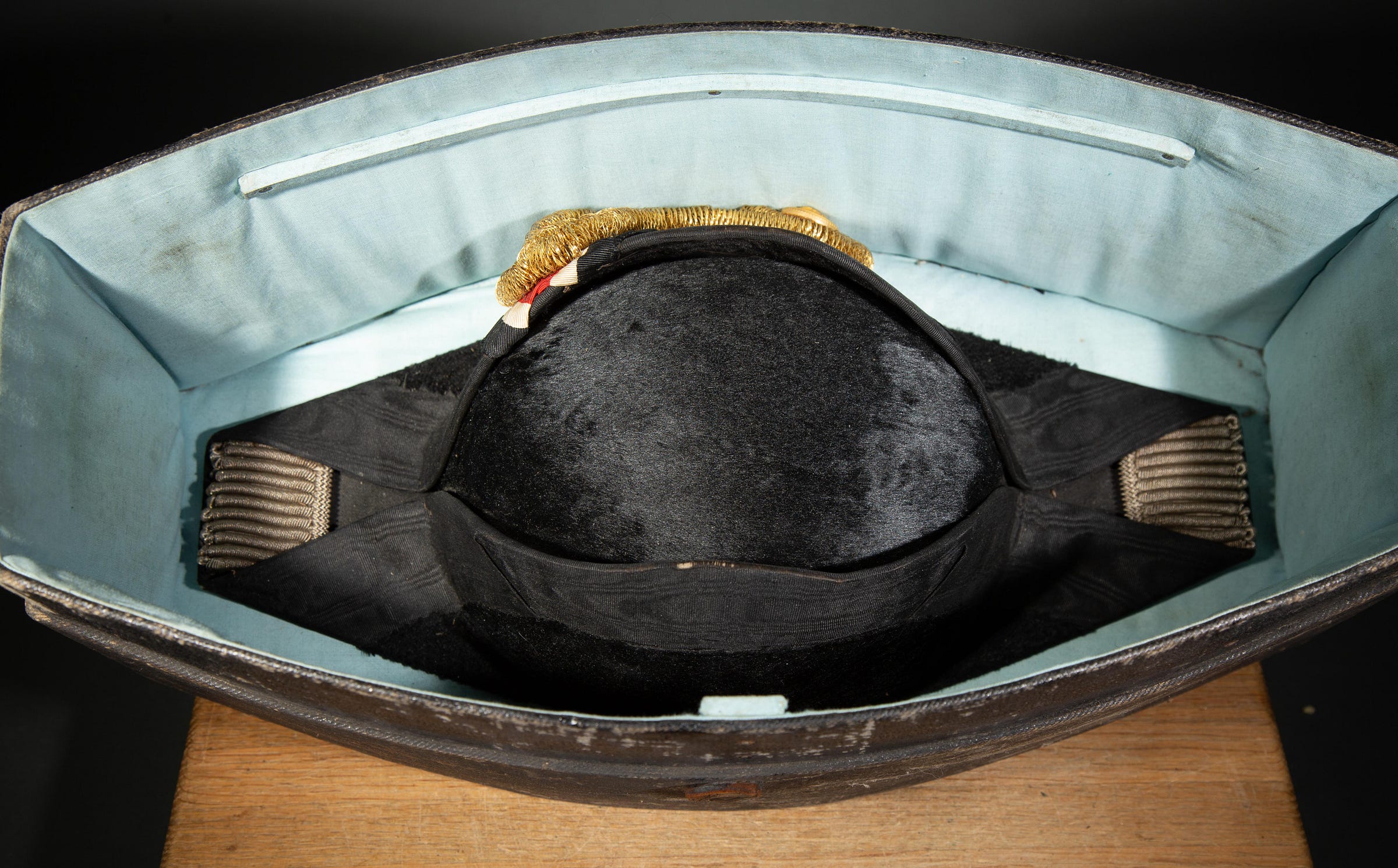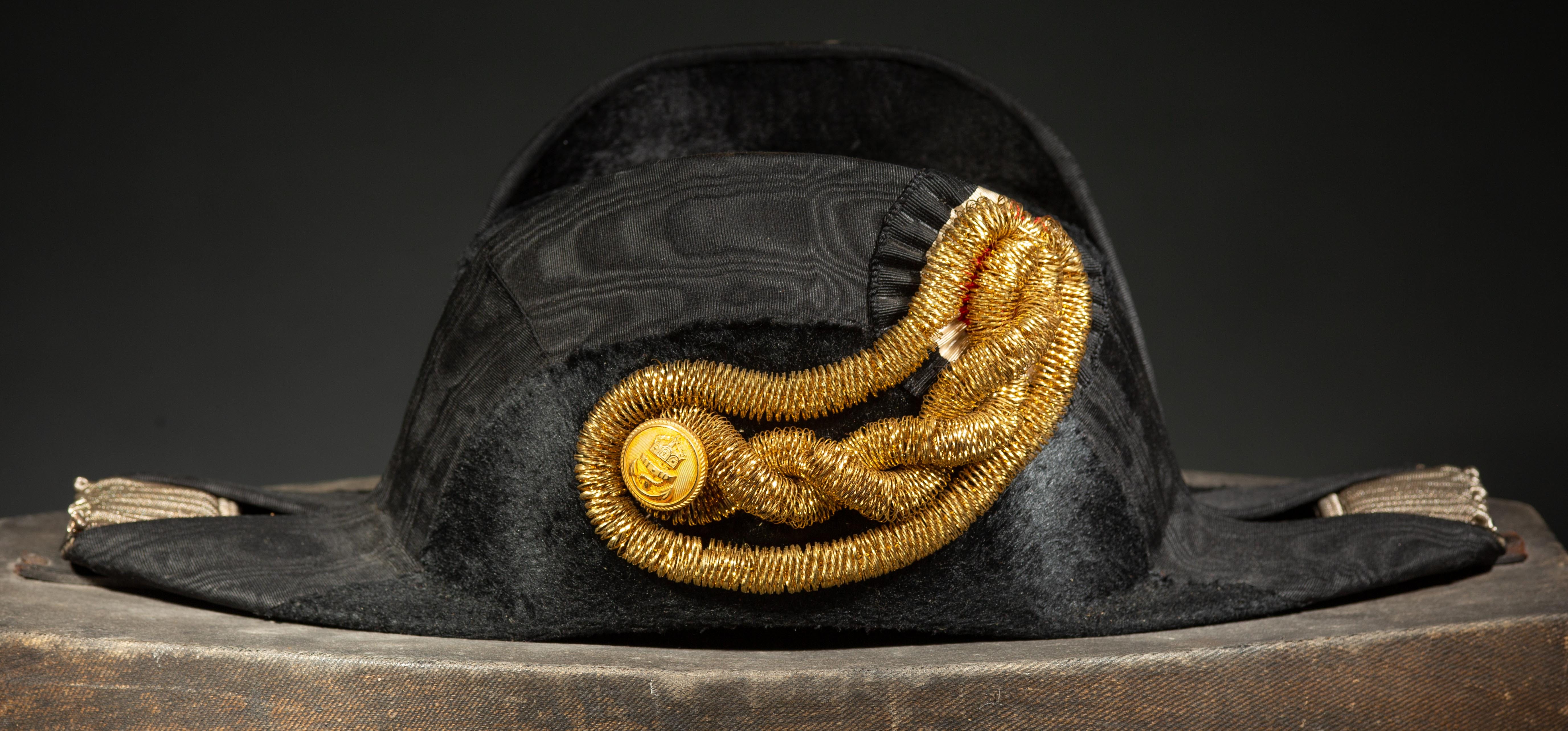 The box has manufacturer markings from Germany. I have not been able to dig into the history of this type of hat enough to know with certainty, but my guess is, U.S. naval officers might look to buy their dress hats from the best milliner’s, and perhaps the best bicorn hats for navy officers, came from Germany? That would be my guess, at this point.